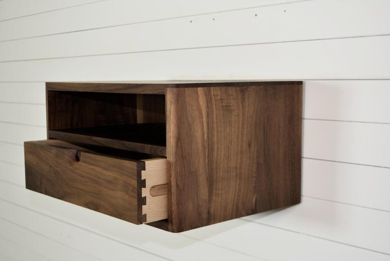 Scandinavian floating nightstand made of solid walnut wood with a drawer and a shelf.